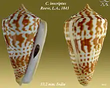- Conus inscriptus Reeve, 1843. Retrieved through: World Register of Marine Species on 26 July 2011.