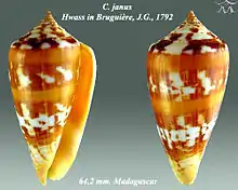 | Apertural and abapertural views of shell of Conus janus Hwass in Bruguière, J.G., 1792 | |