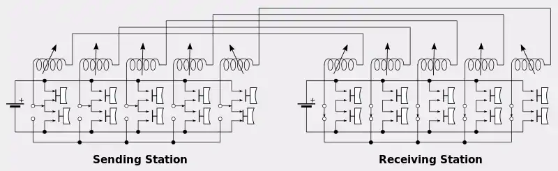 At the sending end there were two rows of buttons, a pair of buttons for each coil in each row. The operator selected one button from each row. This connected two of the coils to the positive and negative ends of the battery respectively. The other ends of the coils were connected to the telegraph wires and thence to one end of the coils at the receiving station. The other ends of the receiving coils, while in receive mode, were all commoned together. Thus the current flowed through the same two coils at both ends and energised the same two needles. With this system the needles were always energised in pairs and always rotated in opposite directions.[31]