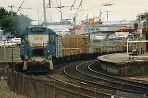 The first railway built in Queensland ran from Ipswich to Dalby. This line was opened to Bigge's Camp (now Grandchester) on 31 July 1865. It extended to Gatton in 1866 through multiple tunnels including the Victoria Tunnel, to Toowoomba in 1867 and to Dalby in 1868.[5] The railway was extended from Ipswich to Brisbane in 1876.[6] The line from Dalby had been extended to Chinchilla in 1878, Roma in 1880, Charleville in 1888 and Cunnamulla in 1898.