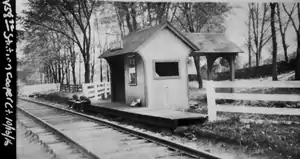 The station first appears on an 1885 timetable where it opened as a flag stop for all trains.[2] From the time of the station's opening until 1888 when the postmaster was caught embezzling stamp sales, a post office was housed in the station.[3] Writer and author Mark Twain, who at that time lived in the neighboring town of Redding, frequently took the train from Branchville to the station in order to meet with his friend Colonel Edward M. Knox,[3] who also played a pivotal role in the creation of the station.[1] Passenger service to the station continued until passenger operations were discontinued on the Ridgefield Branch on August 8, 1925.[4] Although freight service would continue until 1964 on the Ridgefield Branch, the station was abandoned the same year passenger service ended.[2]