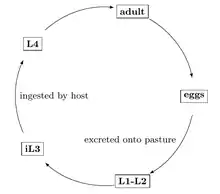 The life cycle of C. oncophora is direct. Free-living L3 stage larvae residing on the pasture are taken up by grazing cattle and pass to the small intestine. Here, they molt to L4 larvae and then to adults. Eggs are passed in the faeces to the pasture. The larvae hatch and grow to L3 stage larvae. Infective L3 stage larvae are then again taken up by grazing cattle and the life cycle repeats. The pre-patent period, which includes the time between infection and egg laying, lasts between two and three weeks. Like other trichostrongylids, early C. oncophora L4 larvae are able to arrest their development under unfavourable environmental conditions such as low temperatures and high dryness, a process termed hypobiosis.[7] L4 larvae can stay arrested up to five months. Arrested development is characterized by a large number of individuals stopping at the same stage of development, a bimodal distribution of worm sizes, and a recent exposure of the host animal to the infectious agent prior to the prepatent period of the infectious agent. During this period of arrested development, the worms stop growing and slow down their metabolism. Arrested development allows the worms to evade many of the anthilmentics commonly used. The recommended doses are based on adult worms and normally developing larvae. Arrested development can be triggered by the following situations: seasonal influences on the larvae while outside the host, the normal host immune response interrupting the normal parasitic phase of the life cycle, or overpopulation of adults that leads to negative feedback preventing the further development of more larvae. It is advantageous for nematodes to enter arrested development as they can survive in hostile environments, cause disease in the host by a large portion of the larvae resuming development, produce large numbers of infectious eggs when the environmental conditions are once again favorable, and avoid susceptibility to various anthilmentics.[8]