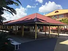 Nevertheless, improvements continued at the school. The Queensland education system recognised the importance of play in the school curriculum and, as school sites were typically cleared of all vegetation, the provision of all-weather outdoor space was needed. Playsheds were designed as free-standing shelters, with fixed timber seating between posts and earth or decomposed granite floors that provided covered play space and doubled as teaching space when required These structures were timber-framed and generally open sided, although some were partially enclosed with timber boards or corrugated galvanised iron sheets.[15] The hipped (or less frequently, gabled) roofs were clad with timber shingles or corrugated iron. Playsheds were a typical addition to state schools across Queensland between c. 1880s and the 1950s, although less frequently constructed after c. 1909, with the introduction of highset school buildings with understorey play areas. Built to standard designs, playsheds ranged in size relative to student numbers.[16] There was a playshed on site at Coorparoo State School by 1887; located directly behind (southeast of) the school buildings. A new playshed, replacing the earlier one and in a similar position, was constructed by RS Exton for £176/8/0 in 1897. The final and only remaining playshed, with ten posts and a hipped roof, was constructed in late 1907 by James Price for £356.[17][18][19][20][21][1]