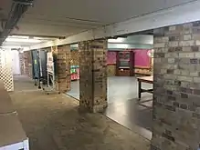 The building layout is highly intact in its original configuration; although new lightweight partitions have been inserted in a number of places. The formerly open undercroft has been partitioned to create a tuckshop, toilets, and a storeroom but retains open areas with original perimeter timber seats and rounded corners to the brick pillars. The ground floor configuration is highly intact. It retains its front staff rooms either side of a short foyer entrance, however, the cloak rooms have been enclosed by a partition to create store or staff rooms. The wall between verandah/corridor and the classrooms retains large double-hung windows, fanlights, and timber French doors, however, the folding partitions that formerly divided all classrooms on this level have been removed to form a long space (used as a library in 2017). This space includes some later glazed partitions and a raised platform that are not of cultural heritage significance. The first floor is a similar layout to the ground and is also highly intact, however, two masonry partitions have been removed to make four classrooms into two. The classrooms on both levels retain their ceilings lined with sheets and battens, with those of the first floor having lattice ventilation panels. The stairwells at either end are intact, retaining iron balustrades and turned, clear-finished timber handrails and bare concrete stairs.[1]