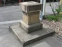 A sundial stands in the grounds in one of the large formerly-open playing terraces to the southwest of Block B (near the northeast corner of Block C). It has a sandstone base and the flat top holds a brass plate of the sundial although the gnomon has been removed. The side of the mount has a brass plaque reading "Wolff Park". [1]