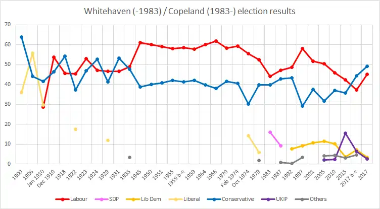 The sole forerunner to the constituency was the abolished constituency of Whitehaven. Copeland consistently returned Labour Party candidates since its creation in 1983 until the by-election of 23 February 2017, when Trudy Harrison gained it for the Conservatives. Prior to that (save for the landslide in 1931 when part of the parliamentary Labour Party remained in government with the Conservative Party under Ramsay MacDonald), the last Conservative elected for the area was in 1924.