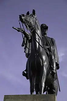 The Duke of Wellington and Copenhagen were the subject of a "colossal" bronze statue designed by Matthew Cotes Wyatt and his son James.[35] Construction of the statue began in 1840, four years after Copenhagen's death, and lasted until 1843. The 40-tonne (40,000 kg), 8-metre-long (26 ft) and 9-metre-tall (30 ft) statue was unveiled on 28 September 1846[36] with much fanfare and was hoisted into a prominent position on top of the Triumphal Arch,[35] then located a short distance from the Duke's London residence, Apsley House, on Hyde Park Corner.[37] Copenhagen's belly had a girth of 22 feet and eight inches and the section was used to host a "celebratory dinner" for Wyatt before the work was completed, and a "rider on horseback could readily pass under Copenhagen's torso without danger of scraping his beaver hat."[38] The portrayal was generally ridiculed in the press and by the public with a French spectator to the unveiling reportedly saying, "We have been avenged!"[35] A young soldier reportedly said Wyatt's statue was "warning ambitious young officers of the fate that awaits them if ever they are so unfortunate as to achieve greatness."[37] The statue was viewable from Apsley House and remained at the Hyde Park location for the remainder of the Duke's life.