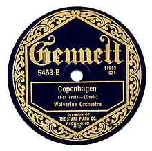 The Wolverines recorded it at Gennett Studios in Richmond, Indiana on May 6, 1924. The single was released by Gennett Records as 5453-B and also by Claxtonola Records as 40336-B as by the Jazz Harmonizers.[2] The A side was "Oh Baby", recorded at the same session. "Copenhagen" was published in the same year (in the Wolverines' arrangement) by the Melrose Bros. Music Company of Chicago, Illinois. At least nine other recordings of the song were released in 1924 alone. The Wolverines' recording features a brief cornet solo by Beiderbecke. Fletcher Henderson and His Orchestra recorded "Copenhagen" on October 30, 1924, five months after the Beiderbecke version.[3] The recording by Fletcher Henderson and His Orchestra, arranged by Don Redman, features a solo by Louis Armstrong.