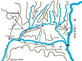 Alexander's next destination was Euspla,[22] where the King of the Aspasians was based. At this point, deeming their cause lost, the Aspasians burned this city and fled.[22] The Macedonians pursued them. During the ensuing combat, one of the Aspasians thrust his spear right through Ptolemy's breast plate,[19] but the spear did not make contact with him due to the armour stopping the severity of the blow.[19][24] It was at this point that Ptolemy killed the King of the Aspasians.[19][24]