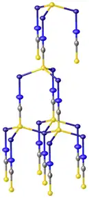 At least two polymorphs have been characterized by X-ray crystallography. They both feature copper(I) in a characteristic tetrahedral coordination geometry. The sulfur end of the SCN- ligand is triply bridging so that the coordination sphere for copper is CuS3N.[2][4]