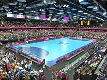 London's Olympic bid proposed that there would be four indoor arenas in the Olympic Park, in addition to other main venues, but the revised masterplan published in 2006 reduced this to three, with the volleyball being moved to Earls Court Exhibition Centre.[5] The fencing arena was also cancelled, and the fencing took place at ExCeL. Construction of the building was completed on time in early 2011 and came in under budget.[6] The design incorporates light pipes and rainwater collectors to reduce both energy and water use by 40%.[7] Test events were successfully hosted at the venue ahead of the Olympic and Paralympic Games in 2012.