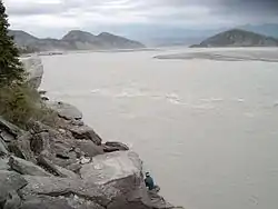 Downstream from its confluence with the Chitina it flows southwest, passing through a narrow glacier-lined gap in the Chugach Mountains within the Chugach National Forest east of Cordova Peak.[12] There is an extensive area of linear sand dunes up to 250 feet (76 m) in height radiating from the mouth of the Copper River.[13][14] Both Miles Glacier and Childs Glacier calve directly into the river.[15] The Copper enters the Gulf of Alaska southeast of Cordova where it creates a delta nearly 50 miles (80 km) wide.[13]