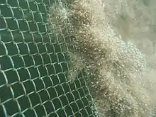 The biofouling process begins when algae spores, marine invertebrate larvae, and other organic material adhere to surfaces submerged in marine environments (e.g., fish nets in aquaculture). Bacteria then encourage the attachment of secondary unwanted colonizers.[2][15]