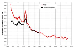 Copper mining activity increased in the early 2000s because of increased price: the price increased from an average of $0.76 per pound for the year 2002, to $3.02 per pound for 2007.[2]
