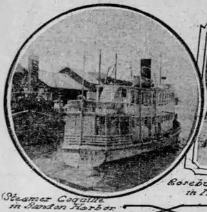 In January 1913, Coquille made two round trips daily between Bandon and Coquille City, and had been doing so since June 1, 1912.[11] The steamer left Bandon at 6:00 a.m. and 1:00 p.m. and arrived in Coquille at 9:30 a.m. and 3:30 p.m.[11] From June 1, 1912 to January 1, 1913, Coquille had carried about 21,000 passengers, which worked out to about 100 passengers per day.[11] The steamer was reported to have Morris chairs for passengers, electric lighting and "many other conveniences of modern river travel."[11]