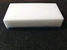 In the early 21st century, it was discovered that melamine foam is an effective abrasive cleaner.[2] Rubbing with a slightly moistened foam may remove otherwise "uncleanable" external markings from surfaces. For example, melamine foam can remove crayon, marker pen, and grease from painted walls and wood finishings, plastic-adhering paints from treated wooden tables, and adhesive residue and grime from hubcaps.[3] If the surface being cleaned is not sufficiently hard, it may be finely scratched by the melamine material. Similarly to a pencil eraser, the foam wears away during use, leaving behind a slight residue which can be rinsed off.