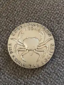 ![]() The obverse of a Corday–Morgan medal awarded in the early 2000s. The crab on the medal is a reference to Morgan's work on the chelate effect. | |