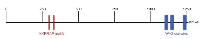 An important functional part of this actin-nucleating protein is the C-terminus, which contains 3 Wiskott-Aldrich syndrome protein (WASp) homology 2 (WH2) domains.[5] WH2 domains are able to associate with actin monomers to funnel them into actin filament formation processes. Cobl in humans contains three WH2 domains located at the C-terminus (the first WH2 domain, WH2.1, lies between 1109 and 1129, WH2.2 between 1149 and 1169 and WH2.3 between 1237 and 1257), that are responsible for forming an "actin nucleus" composed of 3 actin monomers from which an actin filament can be further elongated. The cobl-actin-nucleus is thought to remain at the pointed end of the emerging filament leaving the barbed end free for rapid polymerization. Other critical functional parts are the N-terminal Cobl Homology domain, which can also be found in the ancestor of Cobl, Cobl-like - a protein that is also expressed highly in the nervous system and able to give rise to actin filaments by a mechanism different to Cobl, yet, using in part similar associated components and molecular mechanisms.[17] Cobl Homology domains contain three motifs following the consensus KrRAPpPP (first described as "KRAP" motif of unknown function by Caroll et al., 2003), which represent syndapin I binding sites[6] The polypeptide also contains several further proline-rich sequences, which e.g. bind the SH3 domain of Abp1 and PRMT2.[6][7] Also binding sites for profilin-actin heterodimers have been suggested, selected Ser residues are phosphorylated and two Arginines in the second WH2 domain, which is considered the pace maker of the actin nucleation process were detected to be methylated.[9] In humans there are 5 isoforms of Cobl generated though alternative splicing.