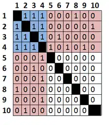 In this idealized matrix, the blue block represents core-core links, the white block represents the absence of periphery links and the red quadrants represent core–periphery ties.