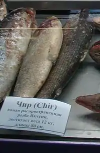 This fish is commonly consumed by humans, especially on a subsistence basis, and its good-tasting flesh is sold fresh, smoked, or dried.[2][4] Also known as Chir, the broad whitefish is one of the species used in the Arctic Siberian dish stroganina.[8]