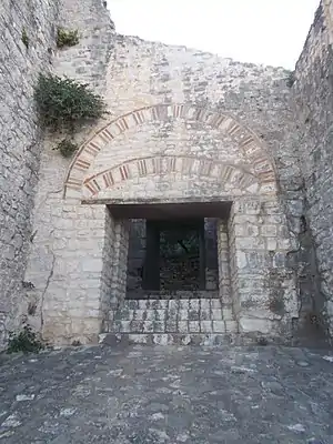 On a precipitous rocky peak dominating a wide range of coastline around Palaeokastritsa stand the crumbling walls and battlements of the twelfth-century Byzantine Fortress of Angelokastro, not far from the village of Krini. (p. 163) [...] After a siege lasting a year the invaders were finally driven away by the defenders of the fortress who were helped by the inhabitants of the neighbouring villages. Again, during the first great siege of Corfu by the Turks in 1537, Angelocastro successfully resisted attack. About 3,000 villagers had sought refuge within the fortress to escape the fate of the inhabitants of other parts of the island who were ... In 1571, when they once more invaded Corfu, the Ottomans again unsuccessfully attacked, Angelocastro, where 4,000 people had taken refuge. During the second great siege of the city by the Ottomans in 1716, Angelokastro once again served as a refuge for the...During the course of the centuries Angelocastro played an important part in the defence of the island. In 1403 a force of Genoese soldiers, under the command of the French condottiere Boucicaut, landed at Palaeokastritsa and attacked ... The fortress existed in 1272 when it was formally taken over by the Italian Giordano di San Felice in the name of the Angevin rulers of Naples, who held the island of Corfu from 1267 to 1386. (p. 164)[...]...Angelocastro was probably built during the reign of the Byzantine Emperor Manuel Comnenos (1143 - 1 180).(p. 164)[...]This was used as a hermitage and was converted into a chapel, probably around the end of the eighteenth century (p. 165)[...]From the top of Angelocastro the view sweeps far and wide over the hills across the breadth of Corfu, to the town, the Eastern Channel and the mountains on the mainland, over a sheer drop of a thousand feet to the sea below (p.325)