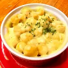 Corn cheese (Korean: 콘치즈, romanized: kon-chijeu, pronounced [kʰon.tɕʰi.dʑɯ]) is a Korean dish made of sweet corn (often canned) and mozzarella cheese (often shredded).[1] It is often served as anju (food accompanying alcoholic beverages).[2][3][4]