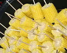 Corn on the cob is a culinary term for a cooked ear of sweet corn (maize) eaten directly off the cob.[1] The ear is picked while the endosperm is in the "milk stage" so that the kernels are still tender. Ears of corn are steamed, boiled, or grilled usually without their green husks, or roasted with them. The husk leaves are removed before serving.