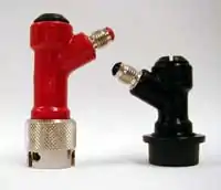 Surplus Cornelius kegs, which are largely obsolete from the soft-drink industry, have been adopted by homebrewers as an efficient alternative to bottling. This is because the kegs are easier to fill, clean, and maintain than industry-standard beer kegs, whose Sankey taps are designed for machines or specialized tools. They are one of the most versatile systems for the home-brewer.[1] Unlike commercial brewers who fill bottles with automated machines, most homebrewers must bottle their beer by hand, which is laborious for a large batch. Without a keg or pressurizing system, the usual way to carbonate bottled beer is by adding a small amount of sugar during bottling, which leftover yeast will consume to produce carbon dioxide. It can be difficult to determine or measure the correct amount of sugar to add, and as glass bottles and metal bottle caps are not designed for high pressures, mistakes can cause the bottles to explode. The most common size of Cornelius keg holds 5 US gallons (19 liters) which conveniently matches the size of a typical batch of home-brewed beer, and kegs can be used to carbonate the beer.[1] This means that rather than saving, cleaning, and filling approximately fifty bottles, the brewer only needs to fill one keg.