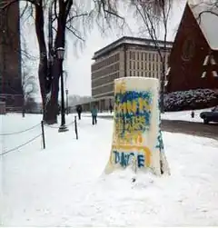 In the 1960s, Dutch Elm Disease finally killed all the elms on Cornell's campus. In 1969, the grounds crew left one six foot tall stump in front of Willard Straight Hall to be a lasting reminder of the elms, affectionately known to Cornellians as the Stump. For a decade, students used the stump as a combination soapbox/message board, delivering speeches from atop the piece of wood and tacking posters to its sides. In 1975, a student group sawed down the stump in the middle of the night and ransomed it for charity. Unfortunately, though the grounds crew reattached the stump, vandals knocked it over again. The stump stayed down, never again to be raised. Today, the stump is memorialized with a plaque at the tree's original location.