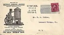 Detroit Engine Works envelope showing not only the standard name and address in the corner card, but also a fancy advertisement with a photograph of one of its products.