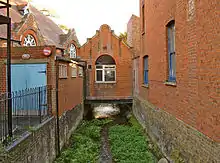 After leaving the River Lee Flood Relief Channel (Horsemill Stream) at Fishers Green the stream flows south to form the western boundary with the former Waltham Abbey Royal Gunpowder Mills before flowing through the Waltham Abbey SSSI within the Gunpowder Mills property. Above Waltham Abbey the stream diverges from the Old River Lea[3] with both channels bordering the Cornmill Stream and Old River Lea, SSSI. The stream passes under the 14th-century Harold's Bridge and the B194 road (Abbey View) before flowing through a sluice in the abbey's grounds. The stream flows underground to emerge adjacent to Waltham Abbey town hall. After flowing through an urban area, it rejoins the River Lee Flood Relief Channel beyond the town of Waltham Abbey.
