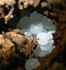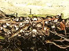 Like other Pulmonata, individuals are hermaphrodites, producing both male and female gametes. Reproduction is predominantly, and probably exclusively, by outcrossing.[30][31] During a mating session of several hours, two snails exchange sperm reciprocally. H. aspersa snails stab a calcite spine, known as a love dart, at their partner. The love dart is coated with a mucus that contains a chemical that enables more sperm to survive inside the recipient. Individuals mate repeatedly between oviposition events and can store viable allosperm for 4 years.[31][32] About 10 days after fertilisation, the snail lays a batch of on average 50 spherical pearly-white eggs into crevices in the topsoil, or sheltered under stones or the like.[30] In a year it may lay approximately six batches of eggs.[33] The size of the egg is 3 mm.[30]