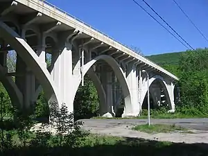 The Cornwall Bridge (also known as Bridge No. 560) is a two-lane, concrete arch bridge carrying U.S. Route 7/Connecticut Route 4 over the Housatonic River and the Housatonic Railroad in northwestern Connecticut. It was built in 1930 by C.W. Blakeslee and Sons for the Connecticut Highway Department and consists of six open-spandrel arches spanning 674 feet (205 m), and is a fairly large example of concrete open-spandrel construction.[2] The bridge was reconstructed in 1994 and was listed on the National Register of Historic Places in 2004.[1]