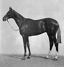 Coronach, a big, handsome chestnut horse standing 16.2 hands high[3] with a white blaze, white socks on his hind feet and a light-coloured mane and tail, was bred by his owner Lord Woolavington.[4] He was sired by the unbeaten champion, Hurry On, making him a representative of the Godolphin Arabian sire line.[5] Apart from Coronach, Hurry On sired the winners of seven Classics including the Derby winners Captain Cuttle and Call Boy. His most influential son was the Ascot Gold Cup winner Precipitation, who sired four classic winners. Coronach was the fifth foal of the mare Wet Kiss who finished fourth in the 1916 Oaks.