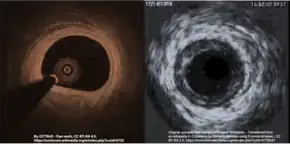 Intracoronary imaging (ICI), consisting of intracoronary optical coherence tomography (OCT) and intravascular ultrasound (IVUS) can help distinguish SCAD from an atherosclerotic lesion when it is difficult to do so with angiography.[20] ICI techniques provide a direct view of the walls of the coronary artery to confirm SCAD, but may actually worsen the dissection as the probes are inserted into the damaged area.[5] ICI confers a 3.4% risk of iatrogenic dissection in people with SCAD compared to 0.2% risk in the general population.[5] Between the two ICI methods, OCT - a newer technique - has superior spatial resolution than IVUS and is the preferred technique if ICI is required,[5] but the need to inject extra contrast with OCT poses risk for worsening the dissection.[15]