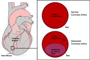 SCAD symptoms are the result of a restriction in the size of the lumen of the affected coronary artery. A bleed within the wall of the artery (tunica intima) originating from the microvessels that perfuse this muscular layer (vasa vasorum) leads to a collection of blood, or hematoma, between the layers of the artery wall.[1] The hematoma pushes close the lumen, preventing blood from flowing to the heart muscle (myocardium). In some cases (~30%) this hematoma (also referred to as an intramural hematoma) is also accompanied by a tear in the inner most layer of the artery - a monolayer of endothelial cells called the tunica intima. It is not clear if this precedes or follows a bleed within the wall of the artery.[10] The tracking of blood within the artery wall (both in the presence or absence of an intimal tear) is referred to as a "false lumen".[11][12][13] The restriction of blood flow in the 'true' lumen limits the availability of oxygen and nutrients to the heart muscle, or myocardium. As a result, the myocardium continues to demand oxygen but is not adequately supplied by the coronary artery. This imbalance leads to ischemia, damage, and in some cases can lead to death of the myocardium tissue, causing a heart attack (myocardial infarction).