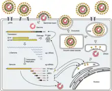 The 5' and 3' ends of the genome have a cap and poly(A) tract, respectively. The viral envelope, obtained by budding through membranes of the endoplasmic reticulum (ER) or Golgi apparatus, invariably contains two virus-specified glycoprotein species, known as the spike (S) and membrane (M) proteins. The spike protein makes up the large surface projections (sometimes known as peplomers), while the membrane protein is a triple-spanning transmembrane protein. Toroviruses and a select subset of coronaviruses (in particular the members of subgroup A in the genus Betacoronavirus) possess, in addition to the peplomers composed of S, a second type of surface projections composed of the hemagglutinin-esterase protein. Another important structural protein is the phosphoprotein nucleocapsid protein (N), which is responsible for the helical symmetry of the nucleocapsid that encloses the genomic RNA.[4] The fourth and smallest viral structural protein is known as the envelope protein (E), thought to be involved in viral budding.[5]