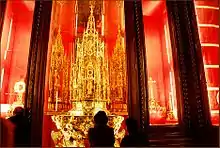 Throughout Christendom, "the custom developed of carrying the Blessed Sacrament in a splendid procession through the town after the Mass on Corpus Christi Day."[7] The monstrance which holds the host is surrounded by a Corpus Christi wreath of flowers.[7] During the procession, church bells are rung and "the faithful kneel in front of their homes to adore the Eucharistic Lord."[7] Along the route in which the procession occurs, Christian homes "are decorated with little birch trees and green boughs", with candles being lit in the windows.[7] Oftentimes, stops are made at various points called "stations" during the procession and "the Blessed Sacrament is put on an altar table" while a Gospel passage is read and hymns are sung, along with prayer being made.[7]