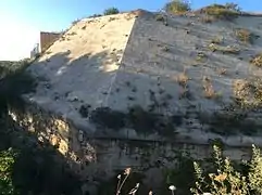 The Corradino Lines were therefore built by the Royal Engineers between 1871 and 1880, at a total cost of £17634. Part of the megalithic temple of Kordin II was destroyed to make way for the new line of fortification in 1871.[5] The defensive line consisted of a V-shaped polygonal-style trace surrounded by a ditch, stretching all the way from the Cottonera Lines to the Ras Ħanżir polverista.[6] The lines were also meant to protect the polverista, which was modified by the addition of an enclosure pierced by musketry loopholes.[7] The lines were armed with two RML 64-pound guns.[8]