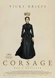 Corsage is a 2022 historical drama film written and directed by Marie Kreutzer. It stars Vicky Krieps, Florian Teichtmeister, Katharina Lorenz, Jeanne Werner, Alma Hasun, Manuel Rubey, Finnegan Oldfield, Aaron Friesz, Rosa Hajjaj, Lilly Marie Tschörtner and Colin Morgan.[6]