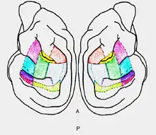 Cats learned to make an orienting response by moving their heads and approaching a 100-ms broad-band noise stimulus emitted from a central speaker or one of 12 peripheral speakers located at 15° intervals from left 90° to right 90°along the horizontal plane after attending to a central visual stimulus generated by a red LED. After the cats had reached at least 80% accuracy in identifying the location of the sound stimulus, each was implanted with one or two bilateral pairs of cryoloops over the different sections of the auditory cortex; 10 sections were defined. Cryoloops were turned on so that the loops reached a temperature of 3°C (plus or minus 1°C), first unilaterally, then bilaterally, next unilaterally on the other side, and finally baseline task performance was recorded after recovering from cooling. This cycle was repeated several times for each cat.[9]