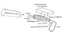 After implantation, when the animal is not participating in an experiment, a protective cap is placed over the open inflow and outflow tubes. During experimentation, the inflow and outflow tubes are attached to the Teflon tubing connected to the reservoir setup. The thermocouple connector is connected to a switchbox and a thermometer so cryoloop temperature can be monitored.[1][2]