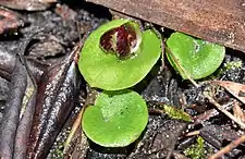 Corybas despectans, commonly known as the tiny helmet orchid[2] or sandhill helmet orchid[3] is a species of terrestrial orchid endemic to southern Australia. It has round or heart-shaped leaf and a tiny reddish purple flower. Unlike many others in the genus, the dorsal sepal does not cover the labellum. It is similar to C. incurvus but the flowers are smaller.