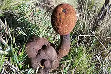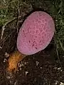Corynaea crassa is a root hemiparasite of a broad variety of plants, thus requiring no sunlight to gather nutrients and lacking leaves. The vegetative body of the plant, and akin other members of the family Balanophoraceae, consist of an accretion of plant tissue known as a haustorial tuber. It is this haustorial tuber where the inflorescences of the plant develop from. The size of the haustorial tuber is directly correlated to the diameter of the host root from which the tuber derives its nutrients. In addition, the number of inflorescences the tuber produces is directly correlated to the diameter of the tuber itself.[11] The emergence of the inflorescence is seasonal.[8] The individual flowers are pollinated by insects of the orders Hymenoptera and Diptera.[11] The rhizome of C. crassa is irregular in shape, with multiple lobes. It turns a rusty color when dried.[12] The inflorescence is typically pink in color, ranging between a yellowish-brown to an intense purple,[13] with the peduncle, or stalk of the plant, having an irregular short and lobed sheath at its base and having a length of 1.5–2.5 centimetres (0.59–0.98 in).[12] The flower head is globose in shape, tapering to become fusiform in shape.[12] The flower heads have a length of between 2–4 centimetres (0.79–1.57 in) and a diameter of between 1.5–2.0 centimetres (0.59–0.79 in).[12] The individual fruits are obovoid, or egg shape, and around 1.5 millimetres (0.059 in) in length and 1 millimetre (0.039 in) in width.[12]