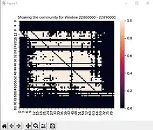 An example of an application using cosegregation would be finding the normalized linkage disequilibrium (NL) between two loci. Given a 2D dataset (row = genomic window slice, column = nuclear profile (NP)) a "1" was displayed if an NP existed in a window or a "0" otherwise. From this data, the NL could be found using the base disequilibrium and its theorized maximum (). The amount of NPs present in loci (genomic windows) and , is then used to find the , and and the co-segregation which is, . after the NL is found between two loci, it was then placed into another dataset to be visualized and then analyzed to determine how interconnected a loci is. This example was executed using python for computation and visualization of the given data and results and in finding the NL. Using the NL further analysis can be done to place the windows into "communities". To showcase this a graph to the right will show the community of one of the windows with the highest centrality which uses the average of the window's NLs.