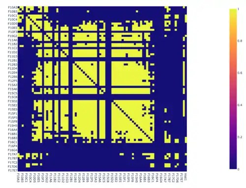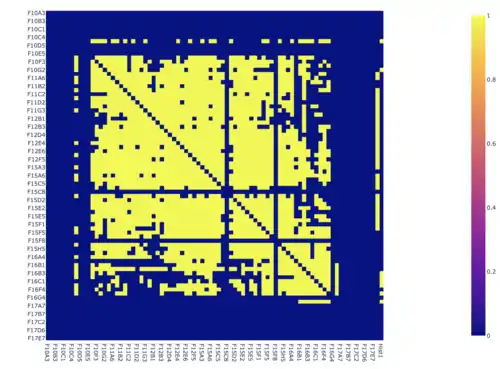 A heat map is a visual representation of a matrix of m × n that can show different phenomenons on a two-dimensional scale. Heat maps have a range of color intensities based on the values and scale given from the data. Coding-wise, heat maps can be created using libraries such as plotly.express in Python. Using co-segregation, heat maps are used to visualize a matrix that contains values of either 1 or 0 to visualize the commonalities between 2 or more variables. "The primary benefit of using heat maps is that they make otherwise dull or impenetrable data understandable. Many people understand heat maps intuitively, without even needing to be told that those warmer colors indicate a denser focus of interactions."[9]