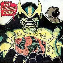 The Cube was eventually found (apparently having reformed) by Thanos[8] who, like the Red Skull, wishes to control the universe (this also attracts the amorous attention of the cosmic entity Death). Although opposed by superhero team the Avengers and the alien Kree warrior Captain Mar-Vell, Thanos becomes supreme when he wills the Cube to make him a part of—and therefore in control of—everything. Thanos discards the Cube, believing it to be drained of power, and is then stripped of the power by the dying superhero named Mar-Vell, who shatters the Cube and restores the universe.[9]