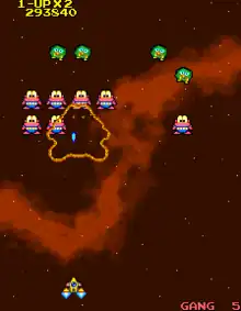 Some enemies will drop special power-up items after being shot, which will give the player one of several abilities when collected — these include a one-hit shield, slow-moving bombs, a black hole that brushes all enemies in its area off the screen, and a jack-in-the-box that stuns all on-screen enemies for a brief period of time.[1] In some rare cases, enemies may drop a Special Flag item from Rally-X that gives the player an extra life when collected.[1] Small "P" items can also be found, which increase the rate of the player's shots when collected.[1] In the multiplayer mode, two other power-up items can appear — one of which swaps the positions of the players, and the other allows the player to "fill up" the other player and make them burst, shooting out a large number of projectiles towards the enemy formation.[1][2]