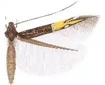 Female. Forewing length 3.9 mm. Head: frons shining ochreous-white, vertex, neck tufts and collar shining dark brown with reddish gloss and some bluish and greenish reflections, lined white laterally; labial palpus first segment very short, ochreous-white, second segment three-quarters of the length of third, dark brown with white longitudinal lines laterally, third segment white, lined dark brown laterally; scape dorsally shining dark brown with a white anterior line, ventrally shining ochreous-white, antenna shining dark brown with a white anterior line from base to beyond one half, distal part interrupted, followed towards apex by one white segment, one dark brown, a white section of approximately eight segments, apical part dark brown and slightly serrate. Thorax and tegulae shining dark brown with reddish gloss and greenish reflection. Legs: shining dark brown, femora shining ochreous, femur of hindleg with golden gloss, tibiae of foreleg and midleg with white medial spots and narrow white apical rings, tarsal segments one to three and five of foreleg and midleg with longitudinal white lines, tibia of hindleg with bluish silver subbasal and medial streaks and a white apical ring, tarsal segments one to four dark brown with golden gloss, segment five entirely ochreous-white, spurs dark greyish brown, apically lighter. Forewing shining dark brown with reddish gloss, three narrow white lines in the basal area, a subcostal from base to one-eighth, bending from costa distally, a medial just above fold from near base to one-third, a short dorsal, starting just before end of the medial, a shining dark yellow transverse fascia beyond the middle with a very long apical protrusion, bordered on the inner edge by a narrow, tubercular, silver metallic fascia with greenish reflection and with a blackish brown subcostal spot on outside, bordered on the outer edge by a longitudinal tubercular silver metallic costal spot with a white costal streak, on dorsum, slightly inward of the costal spot, an oval metallic silver dorsal spot, both spots broadly edged dark brown, a silver metallic apical line from the apical protrusion, changing to shining white in the cilia, cilia dark brown around apex, slightly paler towards dorsum. Hindwing shining dark brown with reddish gloss, cilia dark brown. Underside: forewing shining dark brown, hindwing shining dark brown. Abdomen dorsally dark brown with reddish gloss, ventrally shining greyish brown, segments banded broad yellowish white posteriorly, anal tuft shining dark brown.[1]