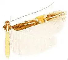 Male, female. Forewing length 5.2–5.5 mm. Head: frons shining ochreous-white with greenish and reddish reflections, vertex and neck tufts shining greyish brown with reddish reflection, medially and laterally lined white, collar greyish brown; labial palpus first segment very short, white, second segment fourth-fifths of the length of third, white with a greyish-brown line dorsally and laterally on outside, basal one-third white dorsally, third segment white, lined dark brown laterally; scape dark brown with a white anterior line, white ventrally; antenna shining dark greyish brown, a white line from base to beyond one-half, at two-thirds an indistinct whitish ring of one segment. Thorax and tegulae greyish brown with reddish reflection, thorax with a white median line, tegulae lined white inwardly. Legs: ochreous-grey, femora of midleg and hindleg shining ochreous-white with some greenish reflection, foreleg with a white line on tibia and tarsal segments one to three and five, tibia of midleg with white oblique basal and medial lines and a white apical ring, tarsal segments one and two with very indistinct ochreous-white apical rings, segment five dorsally ochreous-white, tibia of hindleg as midleg, tarsal segments dorsally ochreous-white, spurs dark grey on outside, whitish on inside. Forewing greyish brown with reddish gloss, four rather broad white lines in the basal area, a broad costal from one-sixth to the transverse fascia, widening distally, a subcostal from base to one-third, bending gradually from costa in distal half, often more or less fused with the costal line and hardly noticeable, a slightly oblique medial from one-fifth to the basal protrusion of the transverse fascia, a dorsal from base to the transverse fascia, a yellow to yellow-grey transverse fascia beyond the middle, narrowed towards dorsum and with a small basal protrusion and a narrow apical protrusion in the middle, bordered at inner edge by two tubercular golden metallic subcostal and dorsal spots, the costal spot with a patch of blackish-brown scales on the outside, the dorsal spot further from base than the subcostal, bordered at outer edge by a tubercular golden metallic costal and a dorsal spot, the dorsal spot about one-half to twice the size of the costal, both spots opposite and inwardly edged dark greyish brown, a narrow white costal streak from outer costal spot and a white apical line from the apical protrusion, cilia greyish brown around apex, pale ochreous grey towards dorsum. Hindwing shining pale grey, cilia pale ochreous-grey. Underside: forewing shining pale ochreous-grey, the white apical line indistinctly visible, hindwing shining pale grey, whitish at apex. Abdomen dorsally shining yellow-ochreous, laterally shining grey, ventrally shining yellowish white, anal tuft white in male, yellowish white in female.[1]